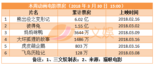 上周动画电影票房方面,《熊出没之变形记》票房突破六亿大关,自上映以来,一直保持高评价高票房的节奏,目前已经成为国产动画票房排名第二。《妈妈咪鸭》的票房基本定格了,这对中国动画既是遗憾也是教训。另外三部法国电影,上周票房涨幅都不大,这也反映出国内外文化差异造成的观众喜好不同,但是在制作质量上,他们是值得我们学习的。
