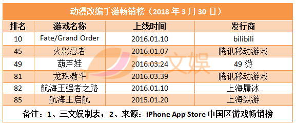 动漫改编手游畅销榜方面,周借着B站上市的热度,B站发行的《Fate/Grand Order》游戏也从上周的80名挤进榜单第十。而《火影忍者》的排名更靠后些,《航海王》系列依然徘徊在前100名靠后阶段。
