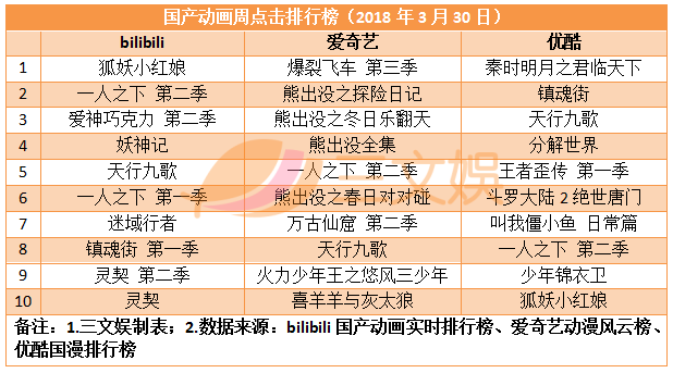 国产动画方面,上周B站更新的国产动漫一周点击量中,《狐妖小红娘》依然人气冲天,长期霸占榜单榜首。而《一人之下》第二季在播出第18集后要停更两周,这让广大粉丝不得不忍一忍了。目前《一人之下》第一季和第二季的点击量依然是长期占据榜单前十,热度可想而知。让人惊喜的是,上周《天行九歌》挤入榜单前十,目前它在B站的评分到达9.7,超过四十万的粉丝在追番。其他作品依旧都是老面孔,排名波动不大。
