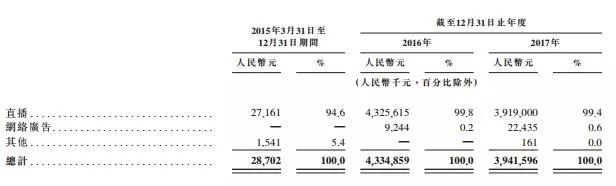 具体看来,映客营收的主要来源有三块:直播、网络广告、其他业务。其中,直播业务营收贡献的比例最大,基本在99%以上。