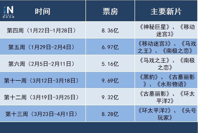 相似的情况在今年1月底、2月初也曾发生过,开年阶段,受《前任3》、《无问西东》等国产影片大热影响,连续三周周票房都在10亿以上。但从第四周开始,新上映的国产影片数量开始减少,尽管也有高分批片《神秘巨星》和好莱坞影片《移动迷宫》、《公牛历险记》、《马戏之王》上映,但即使恰逢寒假,大盘仍旧不理想。也就是说,今年为止票房成绩最差的六周,全部没有热门国产电影新上映。