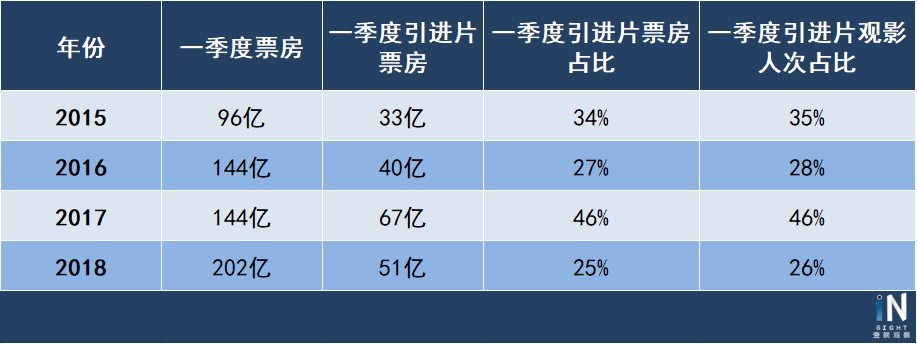 2018年前三个月的走势,却与2016年的第一季度有几分相似。壹娱观察(微信ID:yiyuguancha)在比对了过去几年同期的数据后发现,在今年开年强势的背后的确存在一大隐患:从开年至今,进口片的总体表现都不十分理想,引进片的票房占比更是达到了近年来的最低值25%,类似情况在2016年也出现过,那年一季度引进片票房占比也仅为27%。而在第一季度观影人次创下历史新高的5.6亿的同时,进口片观影人次却只有1.5亿,比2017年的1.9亿还低,26%的观影人次占比也是近年来最低,和2016年相近。