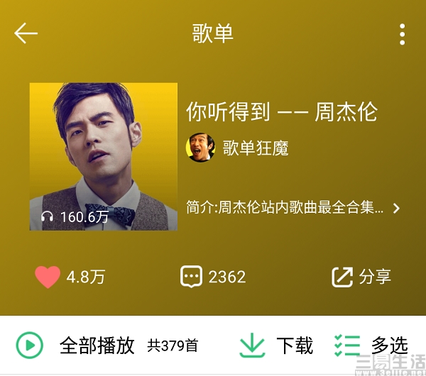 所以这次看到网易云音乐在版权方面又双叒叕出了岔子,而且失去的还是周董的歌曲版权,QQ音乐立刻就在自家首页推出了“你听得到——周杰伦”歌单,这一歌单中包含了周杰伦379首歌曲,截至本稿发布之前,已经获得4.8万收藏。