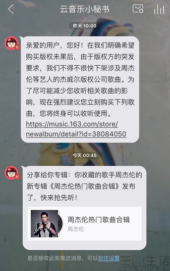 可就是这张专辑,又惹了麻烦——按照网易云音乐和杰威尔公司的合同,周杰伦相关歌曲的版权应在3月31日到期。但有不少网友反映,在4月1日凌晨还收到了来自【云音乐小秘书】的打包专辑推送,甚至在第二天早上七点,这个商品还在网易云音乐平台上售卖,而且已经售出了10万多份。