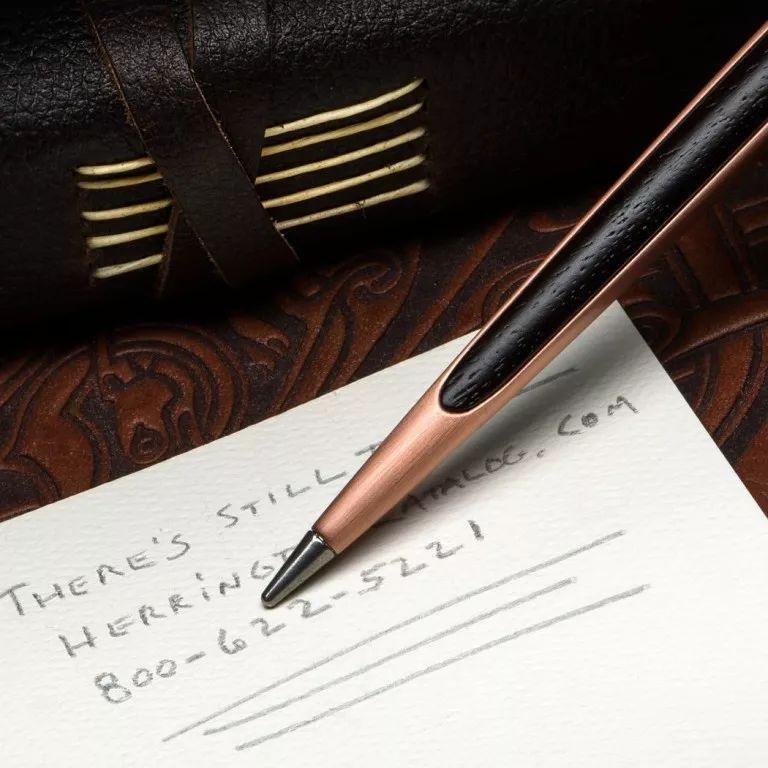 手工制作的笔杆,温润的木头被半包裹在金属之中,一看就知道是支不简单的签字笔。