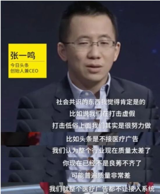 就在去年,今日头条创始人张一鸣做客央视《对话》节目时义正言辞道,“头条不接医疗广告”、“打击虚假、打击低俗”。现今不仅做了医疗广告,且玩起了诸多套路。不知在如山铁证之前,张一鸣又要作何解释。