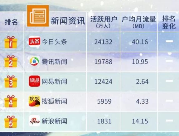 Trustdata发布的《2017年中国移动互联网行业发展分析报告》也证实了这一点,Trustdata Top20移动应用榜单显示,今日头条是其中为数不多的同比涨幅均超50%的APP。