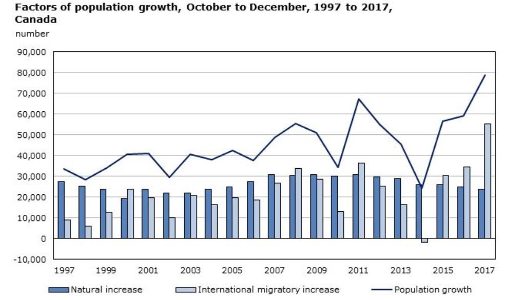 从2017年最后一季度的移民增长人数来看,计划实施得颇有成效。海外移民继续推动加拿大总人口的增长。在此期间,加拿大总人口增加了78805人,将近70%(55048人)来自移民群体。最明显的是在育空省,移民主导了该地区的人口增长。连加拿大统计局都认为,这一增长水平相比同期水平而言非常高。“自从1971年以来,我们很少看到第四季的人口增长有这么强劲。”