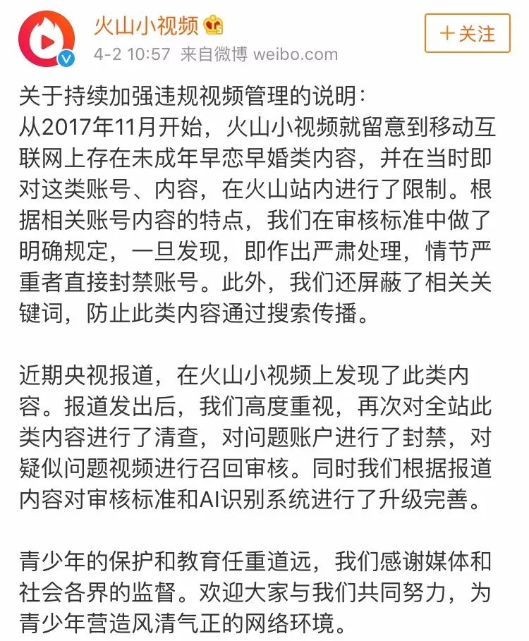 “未成年妈妈”事件中的火山小视频,也不是第一次被央视点名了。2017年4月,火山小视频就因推送涉黄内容被央视点名批评。春节期间,因火山小视频主播MC天佑直播涉毒,导致火山小视频春晚冠名被多家卫视临时撤下。