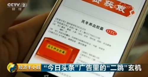 而就在“未成年孕妈”事件曝光前两天,也就是3月29日,央视财经频道《经济半小时》经群众举报,曝光了今日头条“二跳广告”圈套,并指其违反《广告法》。据央视报道,今日头条上的虚假二跳广告以医疗、药品为主,且主要集中在管理宽松的二三线城市,这种黑勾当报价甚至高达“一天百万”。