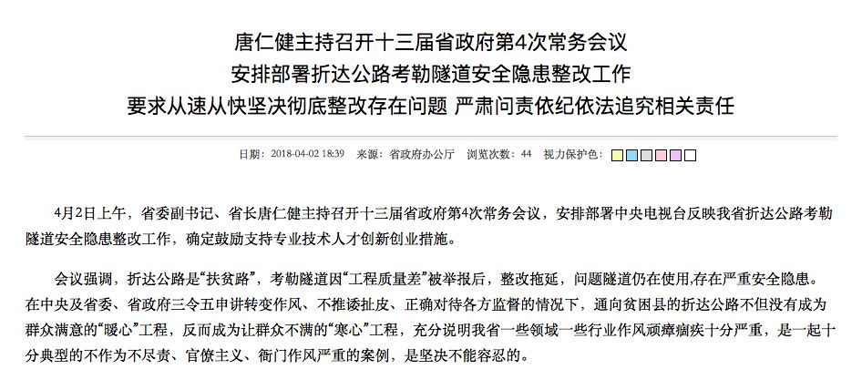 “这是一起十分典型的不作为不尽责、官僚主义、衙门作风严重的案例,发生在三令五申要求转变作风、不推诿扯皮、正确对待各方监督的现在,必须严肃问责,责成交通厅党组立即安排查验现场,全面整改路隧问题,向省委省政府作出深刻检查,省监委启动问责程序,省政府正式函复央视,表明我省态度,诚恳接受监督”。