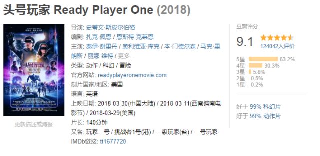 豆瓣9.1、IMDb 8.0,《头号玩家》用2018年最高评价,宣告了大神的回归。天马行空的瑰丽想象、无处不在的彩蛋与惊喜、严丝合缝的剧情演进、穿越现实与虚拟的视觉奇观,共同编织成《头号玩家》的上佳口碑。