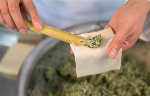 刀鱼混沌就是其中的代表菜品,向来以制作考究,味美绝伦著称。首先取刀鱼肉制成鱼糜,然后放入同样是时令蔬菜的鲜嫩韭菜,打入蛋清,顺时针搅拌至馅料起胶,即可包成元宝状的混沌。