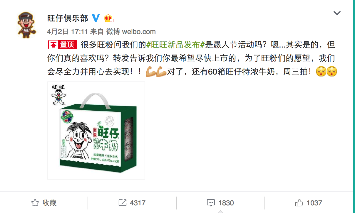 不等人们缓过神来,旺旺又在微博上“自曝”,称之前的新品发布只是一次愚人节活动。但从微博中”转发告诉我们你最希望尽快上市的,我们会尽全力并用心去实现”的表述来看,不排除旺旺有意涉足日化产品,借机征集消费者反馈的可能。