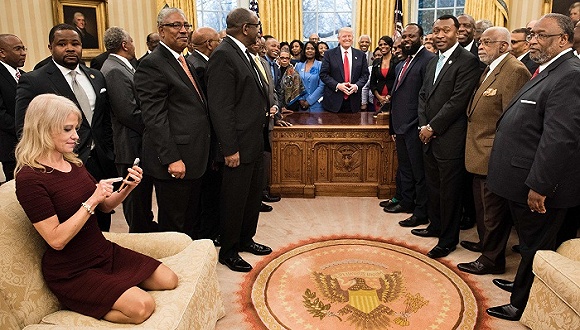 去年2月,当特朗普在椭圆形办公室与非裔历史名校校长会面时,康威穿鞋跪在沙发上拍照,引发了民权人士的强烈不满,指责康威不尊重非裔美国人。
