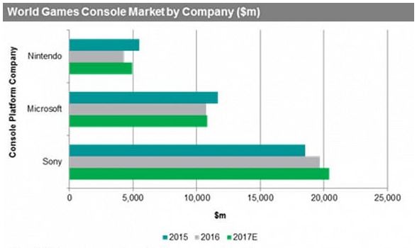 据市场调研机构IHSMarkit此前公布有关全球家用主机游戏市场的报告预测,2017年任天堂在与索尼、微软两大巨头的竞争中,将拿下14%的市场份额。
