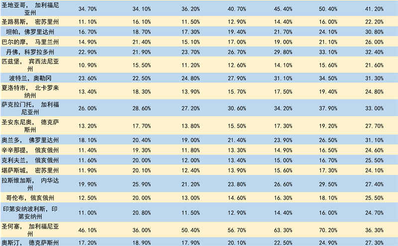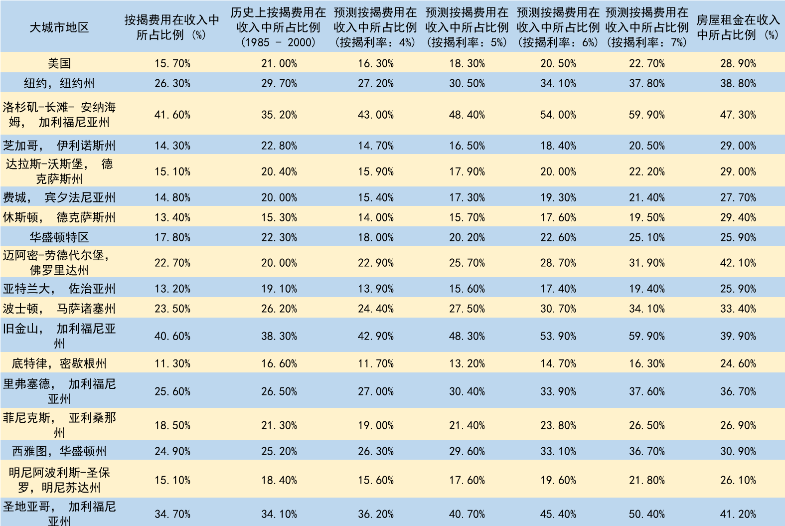 附:各大城市不同房贷利率下的月供/收入比(数据来源:Zillow)
