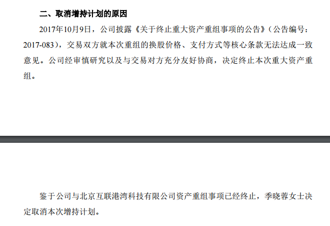 时间一晃很快来到年末,2017年12月29日华星创业发布公告宣称,公司又收到一份季晓蓉提交的《关于取消增持计划的通知》,理由则是因为“鉴于公司与北京互联港湾科技有限公司资产重组事项已经终止”,而这种说法,与一开始的增持承诺中提到的增持理由却完全不同。