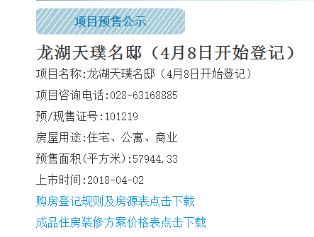 PS:以下是首开龙湖天璞项目此次的预售信息,来源为成都房协官方网站。