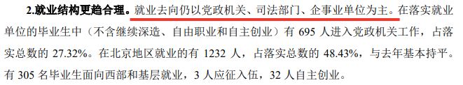 这不仅仅是西南政法大学学生面临的问题,即使是对于位于北京的法大,考公务员也是很多法学生选择的毕业去向。法大2017年的毕业生就业质量报告就显示,学生毕业去向以党政机关、司法部门、企事业单位为主,进入律所的人数不多。