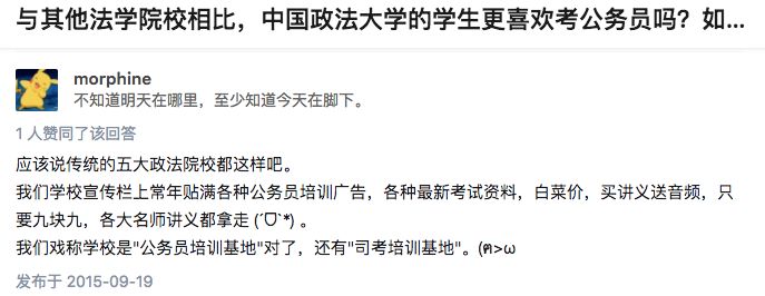 在这一条严丝合缝的路径里,基本没就业什么事儿,大部分的法大学生会把就业放在研究生阶段去考虑,在他们心里有一个模糊的概念,考上了研究生,找到好工作是自然而然的事。
