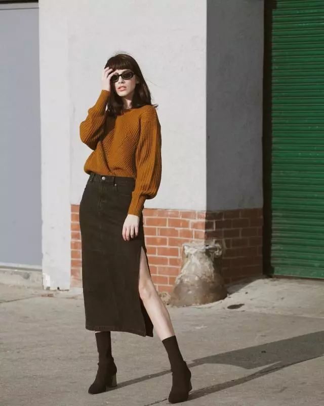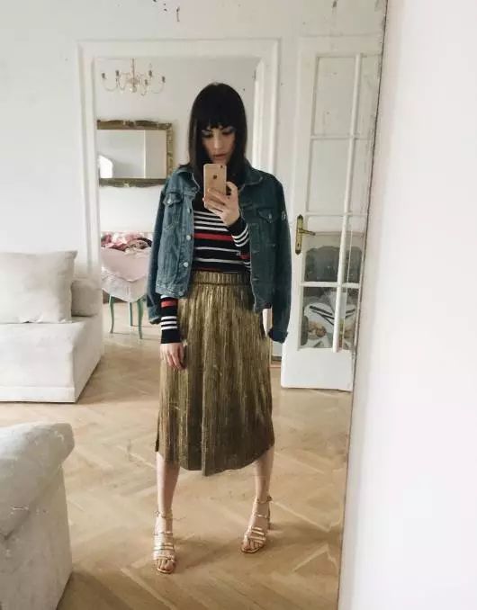 在裙装搭配时,尽量要保持整体颜色的统一。像下面这套条纹针织衫、牛仔外套搭配金色半身裙的造型,就没有下面黄黑两种简单配色的显得高级。