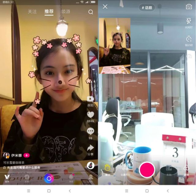同时微视上的短视频内容右侧出现了“跟拍”的选项,点击“跟拍”原视频内容会缩小出现在拍摄界面左上角,用户可直接使用原视频音乐模仿原视频动作进行拍摄。“跟拍”功能的出现是为了降低用户拍摄视频的难度,让视频录制更简单。