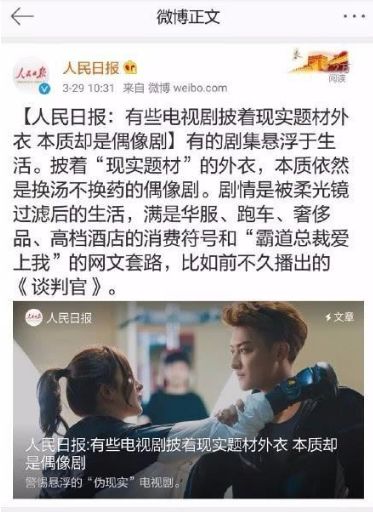 诈捐门一事还没消停,人民日报又公开点名批评杨幂演的剧浮夸、套路、三观不正,“有些电视剧披着现实题材外衣,本质却是偶像剧”,其中杨幂和黄子韬主演的《谈判官》就是典型的例子。