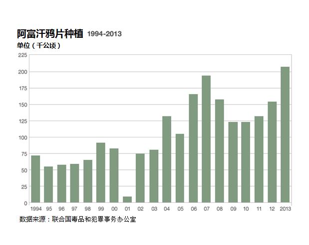 从联合国毒品和犯罪事务办公室提供的数据可以看出,2001年阿富汗战争爆发后,鸦片种植一度被美国及其盟友协力遏制,产量曾出现短暂的下降。但2004年后,美国调整贩毒战争的策略,从摧毁转变成禁止种植和贩卖。