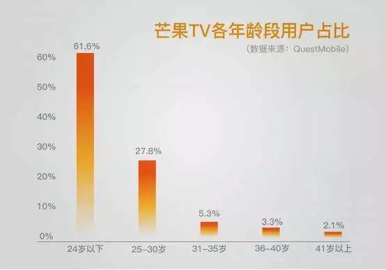 而根据Quest Mobile的数据显示,芒果TV对90后人群的吸引力上表现非常抢眼,其用户群体中24岁以下年龄段人数占比甚至高达61.6%。