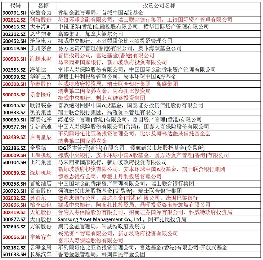 11家公司的十大流通股东名单中,出现了超过两家QFII,这些上市公司包括创新股份(002812.SZ)、海螺水泥(600585.SH)、华泰股份(600308.SH)、乐普医疗(300003.SZ)、启明星辰(002439.SZ)、上海机场(600009.SH)、深圳机场(000089.SZ)、苏泊尔(002032.SZ)、桃李面包(603866.SH)、天虹股份(002419.SZ)、宇通客车(600066.SH),在上表中用红色字体标注。