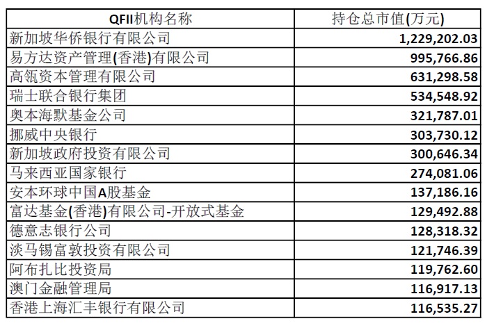 值得一提的是,有三家QFII的持仓集中度很高。新加坡华侨银行对宁波银行的单一持仓达到人民币122.9亿元,高瓴资本对美的集团的单一持仓达到人民币63.1亿元,奥本海默基金对贵州茅台的单一持仓达到人民币32.2亿元。