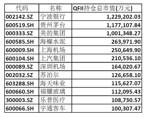 QFII持仓规模最大的上市公司有三家,分别是宁波银行(002142.SZ)、贵州茅台(600519.SH)和美的集团(000333.SZ),持仓规模均超过人民币100亿元。海螺水泥的QFII持仓规模排名第四,但持仓总市值为人民币26.4亿元,大大少于前三家公司。
