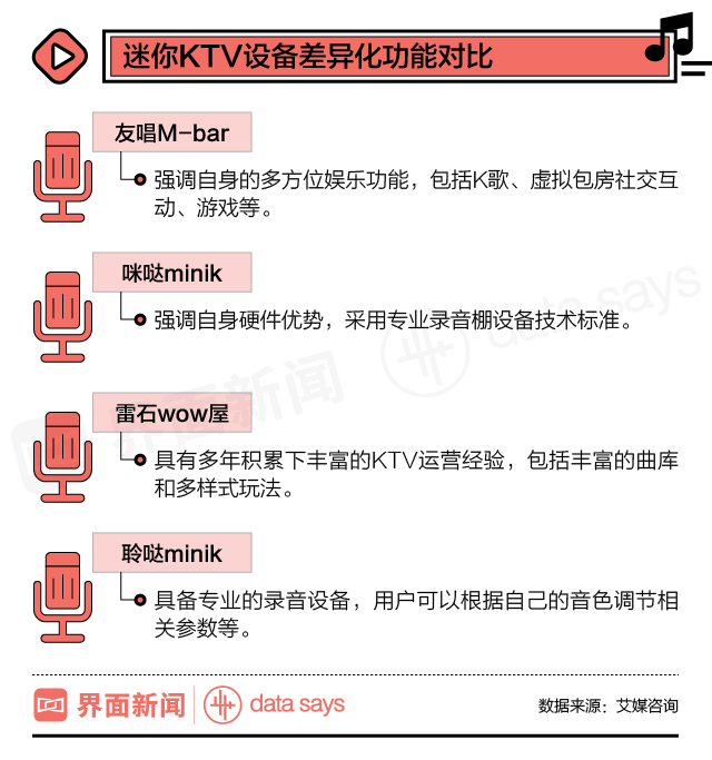 目前多数的线下迷你KTV背靠传统KTV,就竞争格局而言,行业龙头尚未出现。产品间同质化现象严重,所以不同迷你KTV品牌正努力结合自身优势发展差异化功能。