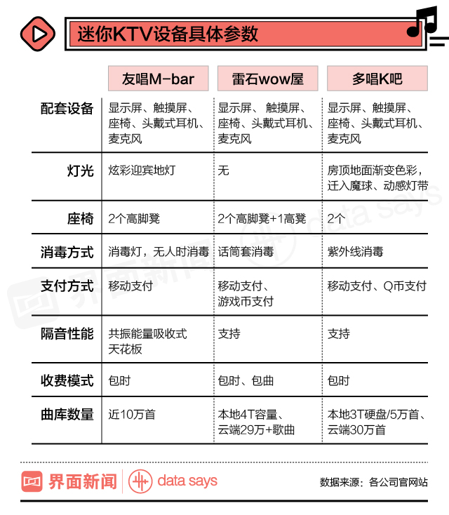 从迷你KTV设备的具体参数也能发现,各厂商产品在外观、配套设备、使用流程、基本功能等方面大同小异。不过各家迷你KTV在曲库数量及灯光方面存在较大差异,其中多唱K吧的曲库最为强大。