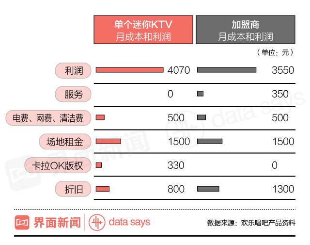 迷你KTV的运营模式主要有两种,分别是直营模式和联营(加盟)模式。一台迷你KTV设备的成本在2万元至3万元之间,取产品成本中位数计算单台迷你KTV与加盟商的余额收入支出占比,前者利润率高达56%,后者也有49.3%。回收周期平均在5-6个月,盈利能力突出。