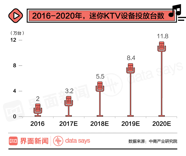 迷你KTV设备的投放也在快速扩张,中商产业研究院数据显示,至2020年有望达到11.8万台。