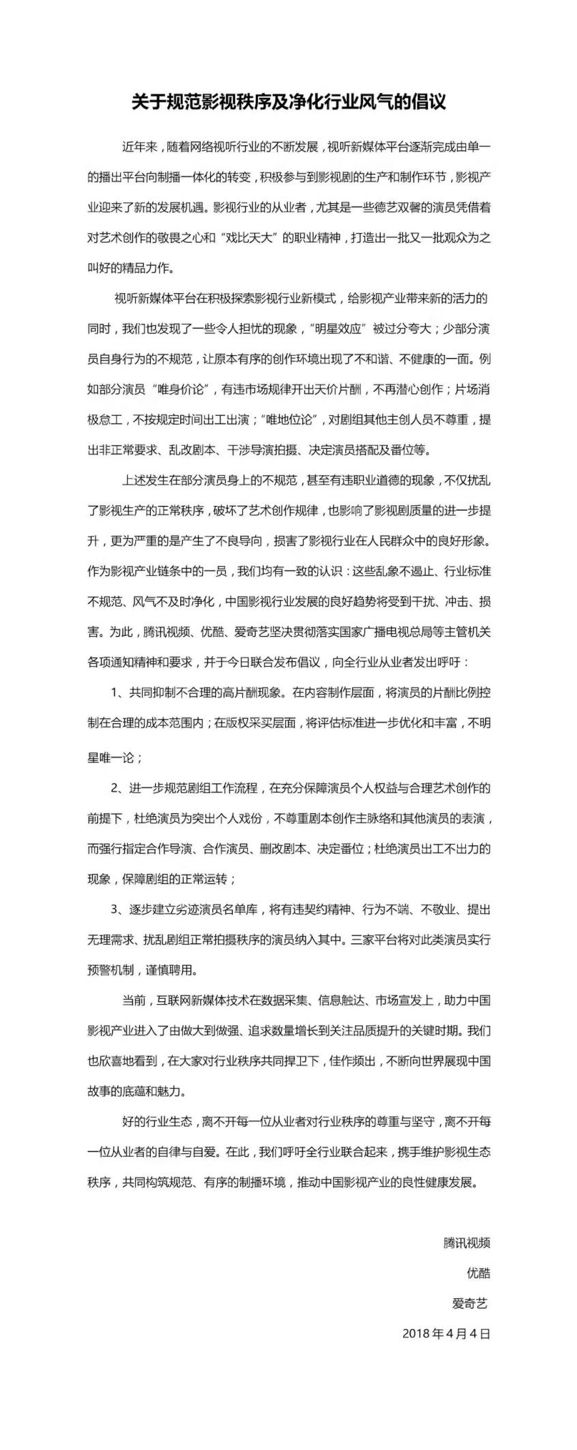 三大视频网站在倡议书中表示目前在影视行业中,“明星效应”被过分夸大,演员的不作为等现象让原本有序的创作环境出现了不和谐、不健康的一面,扰乱了影视生产的正常秩序,产生了不良导向,中国影视行业发展的良好趋势将受到干扰、冲击、损害。