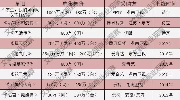 在这张不完全统计的电视剧版权交易价格表中,我们能够看到,一直备受关注的《如懿传》单集售价900万(网)600万(台),按照它99集的体量,整部剧网络版权收益大约在8.91亿元。慈文出品的《凉生,我们可不可以不忧伤》的网络单集售价已经达到1000万。
