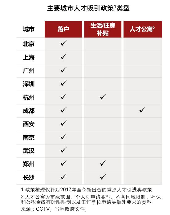 目前,中国主要城市均已经积极参与人才争夺,但人才吸引政策大多先从户籍出发,除杭州、郑州和长沙配以一次性或短暂的生活/住房补贴外,政策的内容和力度均较为同质化。(见下表)