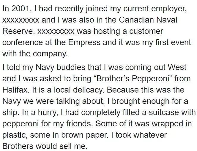 我赶紧告诉海军预备队的小伙伴儿们我要从西部过来,他们让我从Halifax带些“兄弟的意大利辣香肠(Brother's peperoni)”的特产过来。