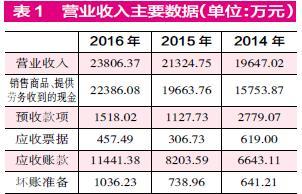 招股书披露,2015年的营业收入为21324.75万元,同期,与营业收入相关的现金流量为21315.10万元(“销售商品、提供劳务收到的现金”19663.76万元与预收款项的减少额1651.34万元之和),两者之间仅相差了9.65万元,理论上这意味着当年应该基本没有什么新增债权之事。可事实上,2015年年末应收账款余额8203.59万元、坏账准备738.96万元、应收票据306.73万元,合计应收款项余额为9249.28万元,这相比2014年末的7903.32万元新增债权达1345.97万元。很显然,这个数据与理论上新增债权9.65万元债权相差了1336.32万元。