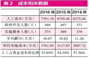 例如,2016年软件开发人数580人、实施服务人数为375人,同时,这年平均薪酬是每人10.67万元,由此测算,这年软件开发和实施服务人员的薪酬总额为10189.85万元。这部分薪酬总额是普联软件在2016年营业成本的最主要组成部分。
