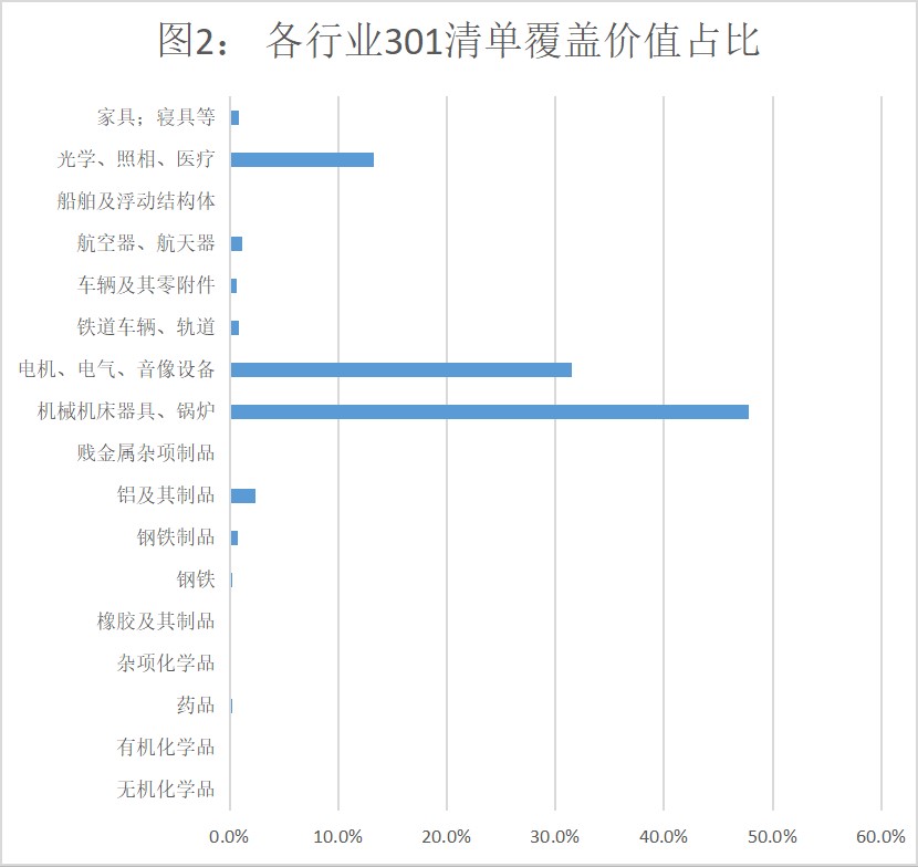 再进一步去看这些被列入301清单的行业,受到的影响有多大。我们将每个HS2位行业里被列入301清单的产品价值加总,除以该行业美国从中国总共进口的价值,就会得到该行业受影响程度的一个测量指标。