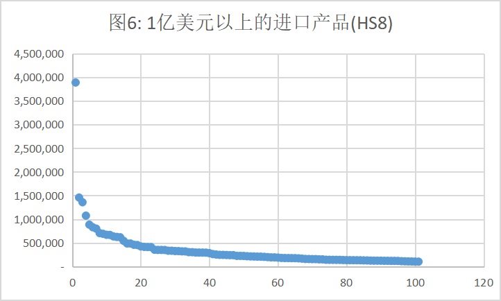最后,我们还可以看一看这1300余项8位HS代码产品的进口值分布。有些意外却又合乎情理的是,美方301清单的打击面非常分散。图6给出了按照2017年美国从中国进口价值在1亿美元以上的产品——大致可以认为超过1亿美元的进口具备了一定的规模。在全部1333项产品中,只有101项超过这个标准,更只有4项超过10亿美元,分别是平面屏彩电(38.9亿美元),载人汽车(1500ml<排量≤3000ml)(14.6亿美元),印刷及印刷用辅助机器的零件(13.6亿美元),以及铝合金矩形板、片(10.8亿美元)。这种分散打击的策略与中方旋即推出的反制清单集中打击的方式完全不同。
