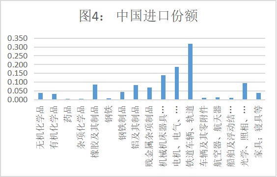 美国贸易代表莱特希泽在解释清单的制定时提到,选择商品的一个原则是“可替代性”。衡量可替代性的一个方式就是去看同类产品来自中国进口的份额(也可以理解为市场占有率)。从图4可以清楚地看到:铁道车辆轨道装备(31.9%)、电机电气和音像设备(18.6)以及机械机床装备(13.9%)占据的份额超过10%,但只有铁道装备份额达到30%以上。因此从可替代性上讲,美国的301清单确实做了精心的挑选,留足了应对供给短缺的空间。