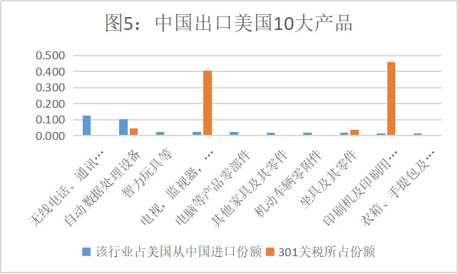 那么美国的301调查又能否实现缩减美中双边巨额的贸易赤字的目标呢?要回答这个问题,不妨进一步看看中国出口到美国的主要产品。我们按照4位HS编码美国进口值排序,找出从中国进口排名前十的HS4位产品,包括无线电话等通讯设备(比如手机),自动数据处理设备(比如电脑),玩具,汽车零附件等。这10种HS4产品就占了2015年美国从中国进口全部货物价值的40%,占美国对中国逆差总值的一半。图5给出了详情:在十大产品中,位居进口额第一位的通讯和第三位的智力玩具没有被清单所覆盖,第二位的自动数据处理设备(主要是电脑)则只有不到5%的进口额受到清单影响。而电视投影设备、打印设备是唯二受到清单重点“关照”的产品(如橙色柱体所示,301关税覆盖的货物价值在这两个行业占比都超过了40%)。