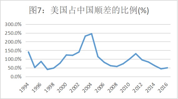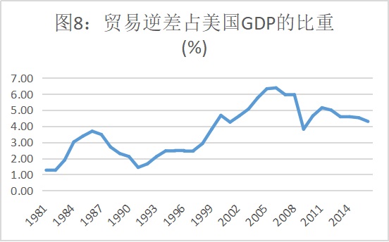 值得一提的是,中美两国的贸易失衡,在近年来有了显著的改善。如图7所示,2016年美国占中国货物贸易顺差的比重,已经只占50%,这比起2003、2004年左右动辄超过200%的比例,可以说是巨大的进步。而从美国的角度看,2016年以来,美国经济一路向好,货物贸易逆差占美国GDP的比重也从2005年的6%以上,下降到如今的4%(图8)。因此,对美国来说,逆差问题并不迫切,迫切的也许是即将到来的中期选举,也许是对东部新兴大国科技进步的忧虑。