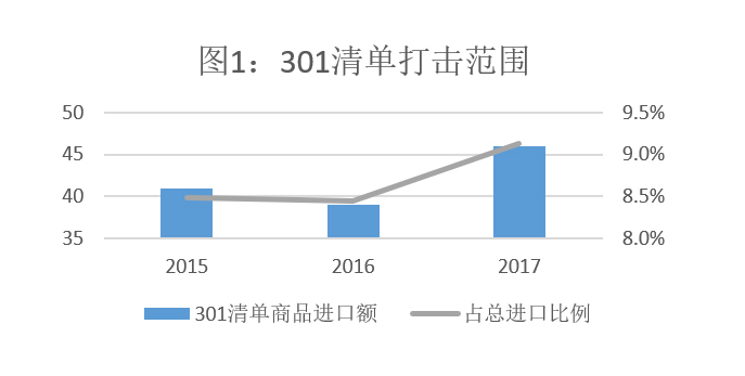 首先,我们把美方列出的301调查方案报复名单与美国进口数据匹配,来看看这次301征税清单的影响力度(本文使用的贸易数据除非特别说明,均来自于美国统计局进出口数据)。从数量上看,301清单一共列出1333项商品(8位HTS代码),2017年中国对美只出口了其中的1282项,占美国全部进口8位HTS商品种类(约9461项)的13.6%。从价值上看,2015到2017三年间,中国在301惩罚清单上的输美商品价值分别是409亿、390亿和462亿美元,分别占当年美国从中国进口的8.5%、8.4%和9.1%,并没有达到特朗普声称的600亿美元的货值。值得注意的是,我们这里使用的是美方统计的进口货值,与中国海关统计的出口美国货物价值存在一定的差异。