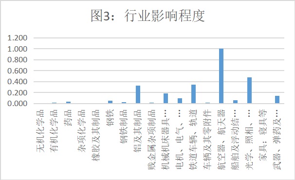 由图3可见,仅就对美出口行业而言,不同行业受到301调查的打击力度也很不一样。大体而言,受清单影响较大的包括机械机床(18.8%)、铝制品(32.6%)、铁道车辆轨道装备(34.7%)、光学医疗设备(48.1%)、以及航空航天器(99.9%),显然都剑指中国制造2025中列出的重点发展领域。特别是航空航天装备,2015年美国从中国进口了大约4.87亿美元的产品,尽管价值非常小,但由于其发展前景和高科技的行业特质,基本被清单“一网打尽”。